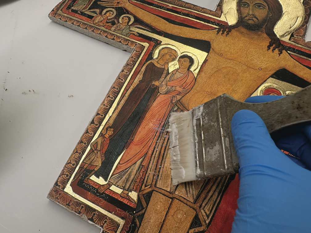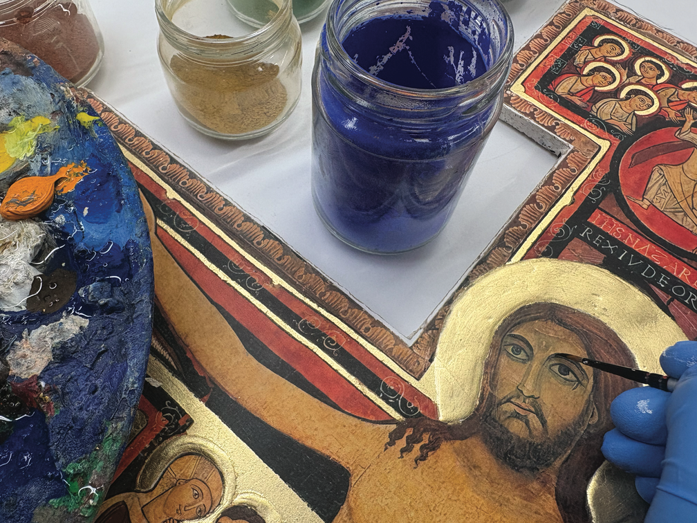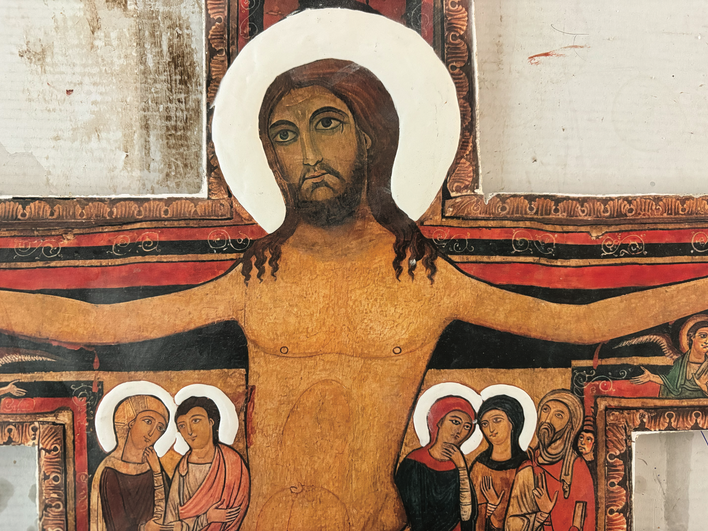 Non è solo un crocifisso: è una finestra spalancata. Il San Damiano non ti chiede di guardarlo, ma di lasciarti guardare. Cristo non è curvo dal dolore: è dritto, vigile, con gli occhi aperti. È il “Cristo vivente”, quello che muore amando e già risorge amando.
