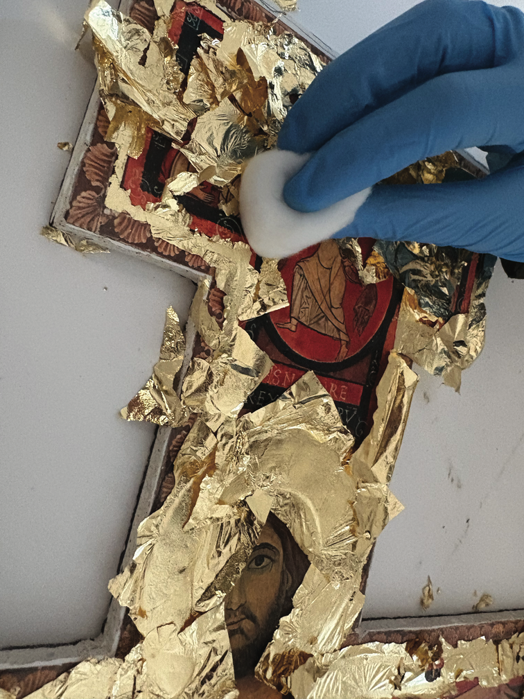 Per questo il fondo brilla: l’oro non è decorazione, è il colore di Dio, una luce che non fa ombra. Il corpo allungato di Gesù sembra un ponte: dalla terra in basso al cielo in alto, dove una piccola scena lo mostra già accolto nell’abbraccio del Padre tra angeli sorpresi.